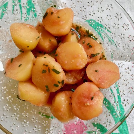 Elle est rose: c’est le jus de betterave (congelé) ajouté au bouillon. Estragon, congelé aussi ( moyen)