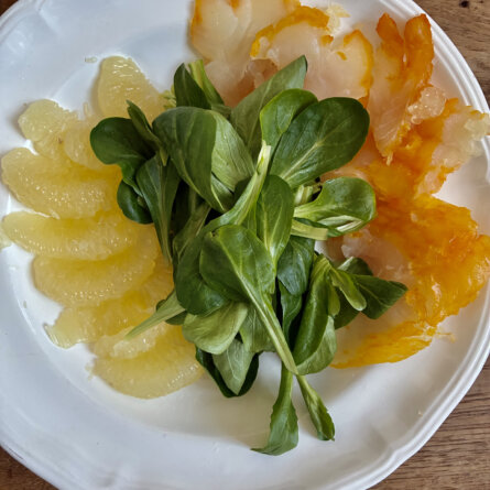 Menus du Samedi 5 avril 2025 Excellent, sauf l’utilisation du pomelo, trop sucré. A faire avec un pamplemousse « normal » Déjeuner Dahl pour la cuisinière toute seule (prêt en 15mn, avec le reste des lentilles et des pois chiches) Poire Dîner Bouillon de queue de veau (cuite dans le bouillon de légumes ) du congélateur, un régal Salade: Haddock fumé cru, mâche et pamplemousse Fraises et crème