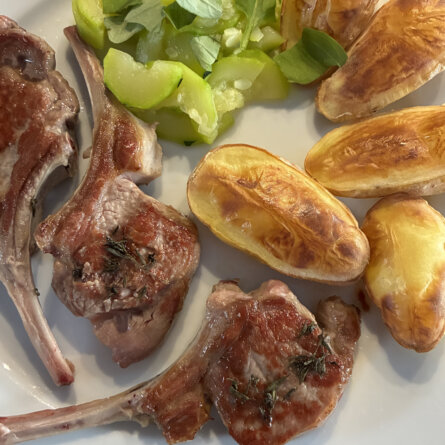Menus du Samedi 5 juillet 2025 Les courgettes: en compote pour « mouiller » les pommes de terre Déjeuner du retour Velouté de lentilles Salade de concombre Fromages de Serena, du Valmalenco Dîner Côtes d’agneau Pommes de terre à la Suisse Courgettes Cerises
