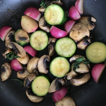 4 champignons, 1/2 courgette, 4 radis + leur fanes dans un peu de huile et de beurre, 3 gouttes de sauce soja: et que ça saute!