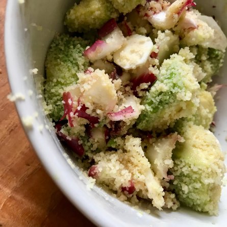 Menus du Vendredi 10 janvier 2020 Un agréable plat complet pour le déjeuner fait avec peu de choses Déjeuner Salade: avocat, endives carmina, semoule de couscous, racine de persil. Voir aussi cette salade là Poire Dîner Bouillon de légumes d’Élise (du congélateur) Gnocchi aux épinards très fins Salade de radicchio Compote de pommes Bramley au pain d’épices