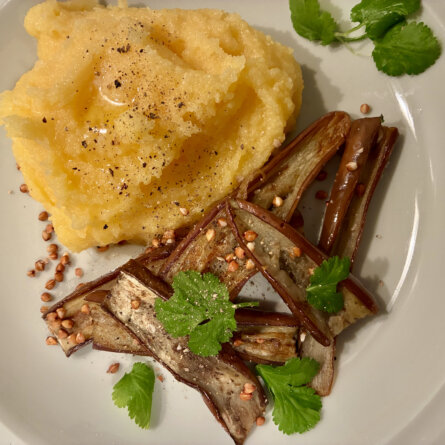 Menus du Vendredi 12 décembre 2025, le retour …+ quelques grains de sarrasin torréfiés dans la poêle et pluches de coriandre Déjeuner Hareng fumé, suite et fin avec une salade de pommes Poire et Comté Noix Dîner Aubergines mauves et polenta minute Salade radiccio Gâteau moelleux au chocolat Clémentines