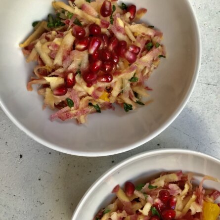 Menus du Vendredi 12 janvier 2024 Des rubis de grenade ne gâtent rien! Déjeuner Salade: carottes roses et pommes râpées, persil Œuf mollet (à 1400 m plutôt 8 mn, que 6) Jambon culatello Dattes Dîner, régional Langue de bœuf fumée, un plat économique, exquis et rare (la langue fumée se trouve maintenant difficilement) Polenta bramata, cuisson longue, sauce tomate Compote de pommes et coulis de cynorodhon