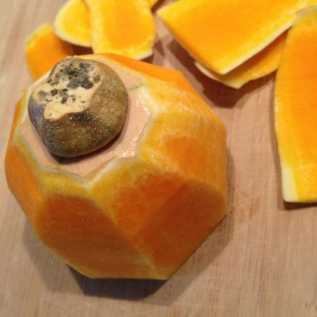 Menus du Vendredi 19 octobre 2018 Butternut: première ! D’abord, éplucher le cucurbitacé sans se couper Déjeuner Bettes au gratin tout simple (cuites à l’eau, passées sous le grill avec crème et parmesan) Porc froid (le reste), cerises au vinaigre Kaki Dîner « Raviolis » de courge butternut expérimentaux Salade: haddock et coco, basilic Compote de quetsches, les dernières de la saison