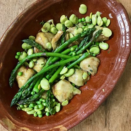 Menus du Vendredi 24 mai 2019 Avec les encornets, un mariage en rose en vert, original et très heureux ! Déjeuner Salade Bindella, avant que ne finisse la saison des oranges Tome de Savoie avec de la confiture de figues (à faire en septembre) Dîner Encornets (du congélateur) servi avec… Des asperges vertes, des artichauts poivrade, des fèves, et des petits pois Fromages: Brie de Melin, Saint Nectaire de Saint Nectaire, Bouyguette Crumble: un mélange de rhubarbe, de pomme et de framboises (du congélateur)