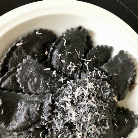 Raviolis de chez le traiteur italien au fromage de chèvre et aux pruneaux: très décevants, comme sont souvent ces raviolis artisanaux …sauf les ravioles