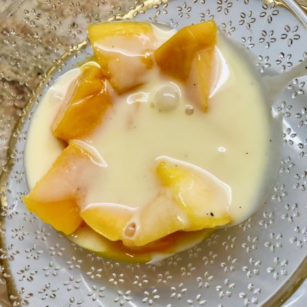Menus du Vendredi 9 avril 2021 Cette crème: le petit Jésus en culottes de velours Déjeuner Asperges vertes, œuf mollet, parmesan Sandwich aux fraises d’Irène Dîner Suite et fin du poulet aux clémentines Fenouil poêlé, déglacé au jus d’orange Semoule suite et fin Crème à la vanille avec de la mangue